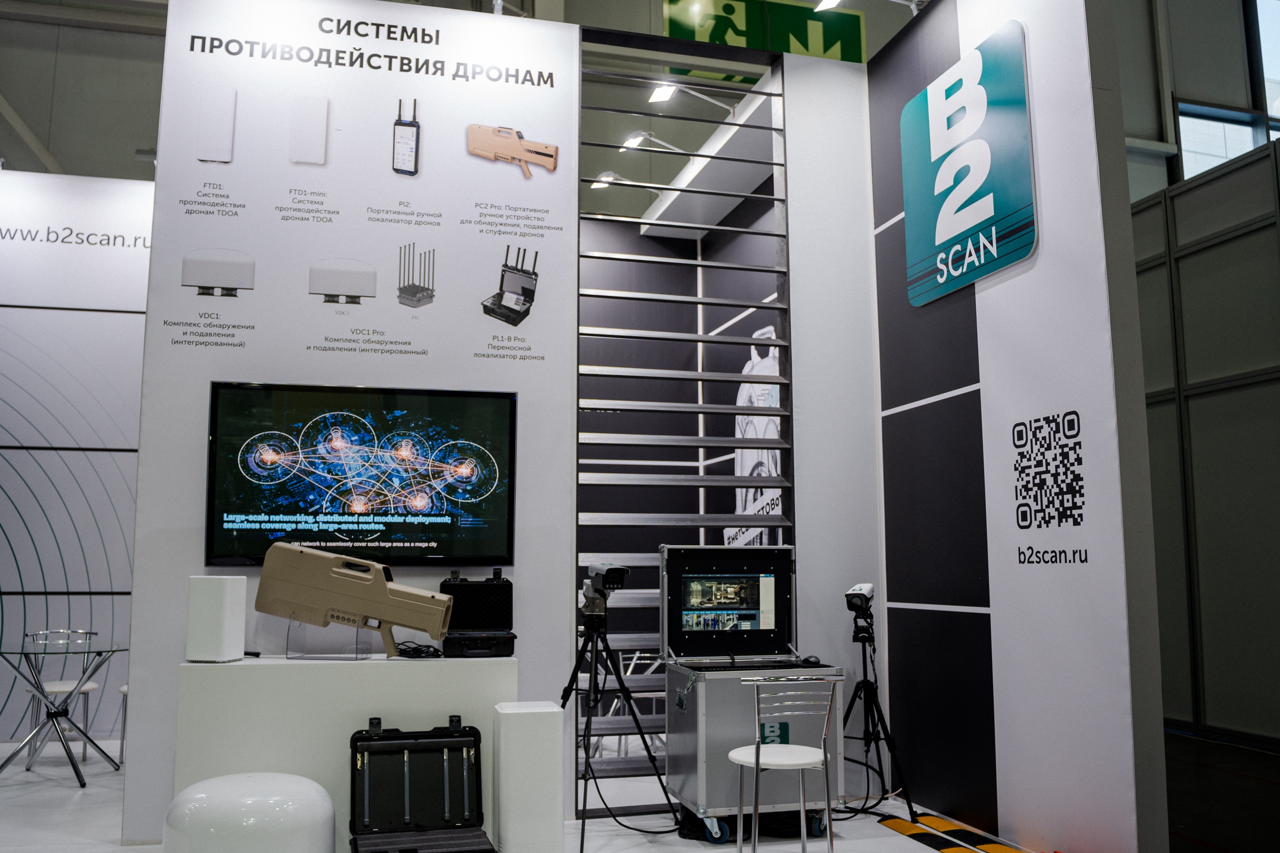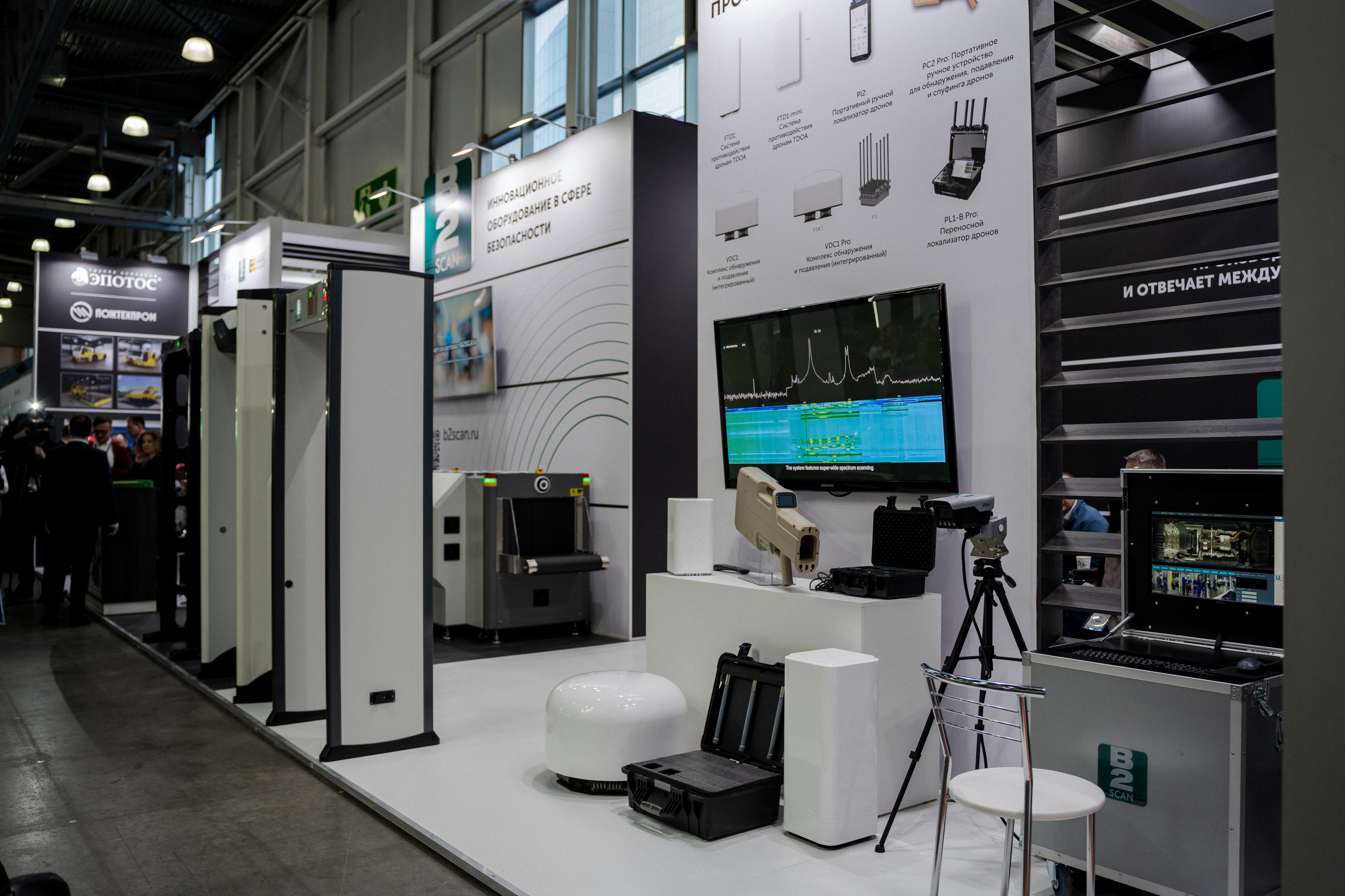 Компанией B2SCAN на стенде H510 были экспонированы собственные решения и технологии в области общественной безопасности: обновлённый арочный металлодетектор B2SCAN SD1000, и две новинки: передовой арочный металлодетектор B2SCAN SD3000 и модульный всепогодный арочный металлодетектор B2SCAN SD4000. Кроме того, компания представила системы противодействия дронам, а также автоматические системы пожаротушения для аэродромной техники
